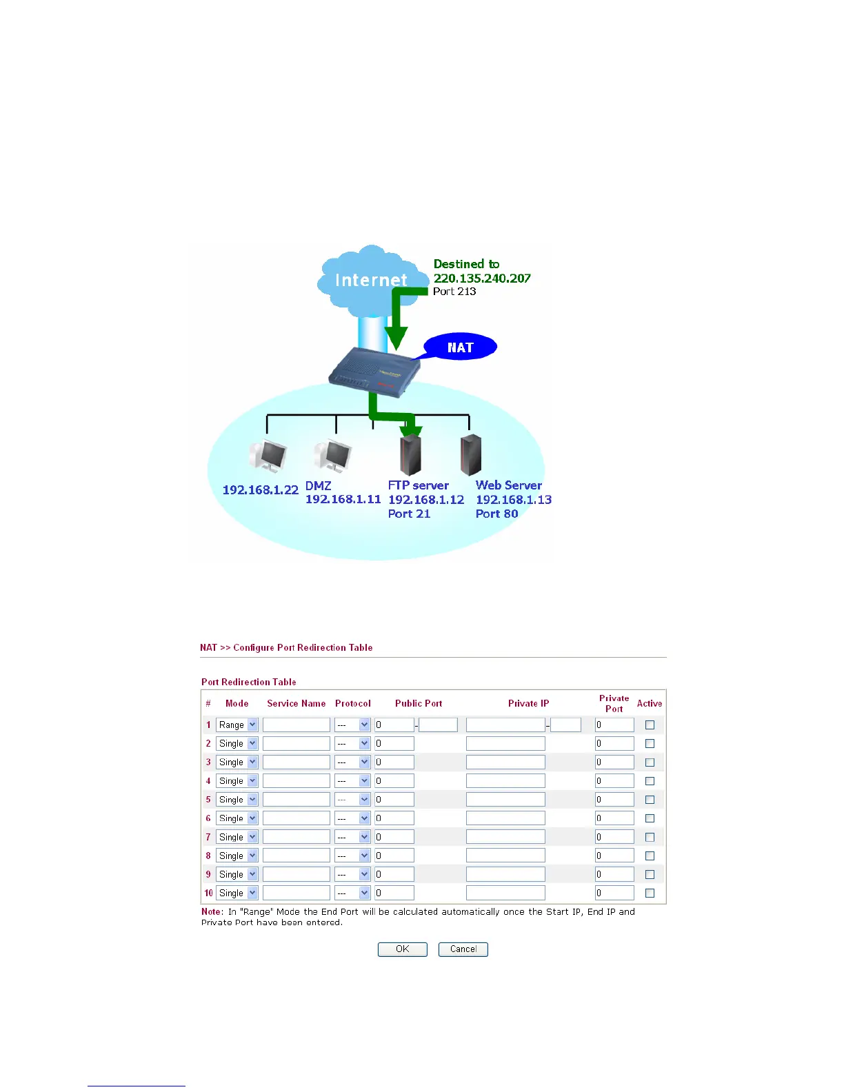 Port Redirection Table provides 10 port-mapping entries for the internal hosts.