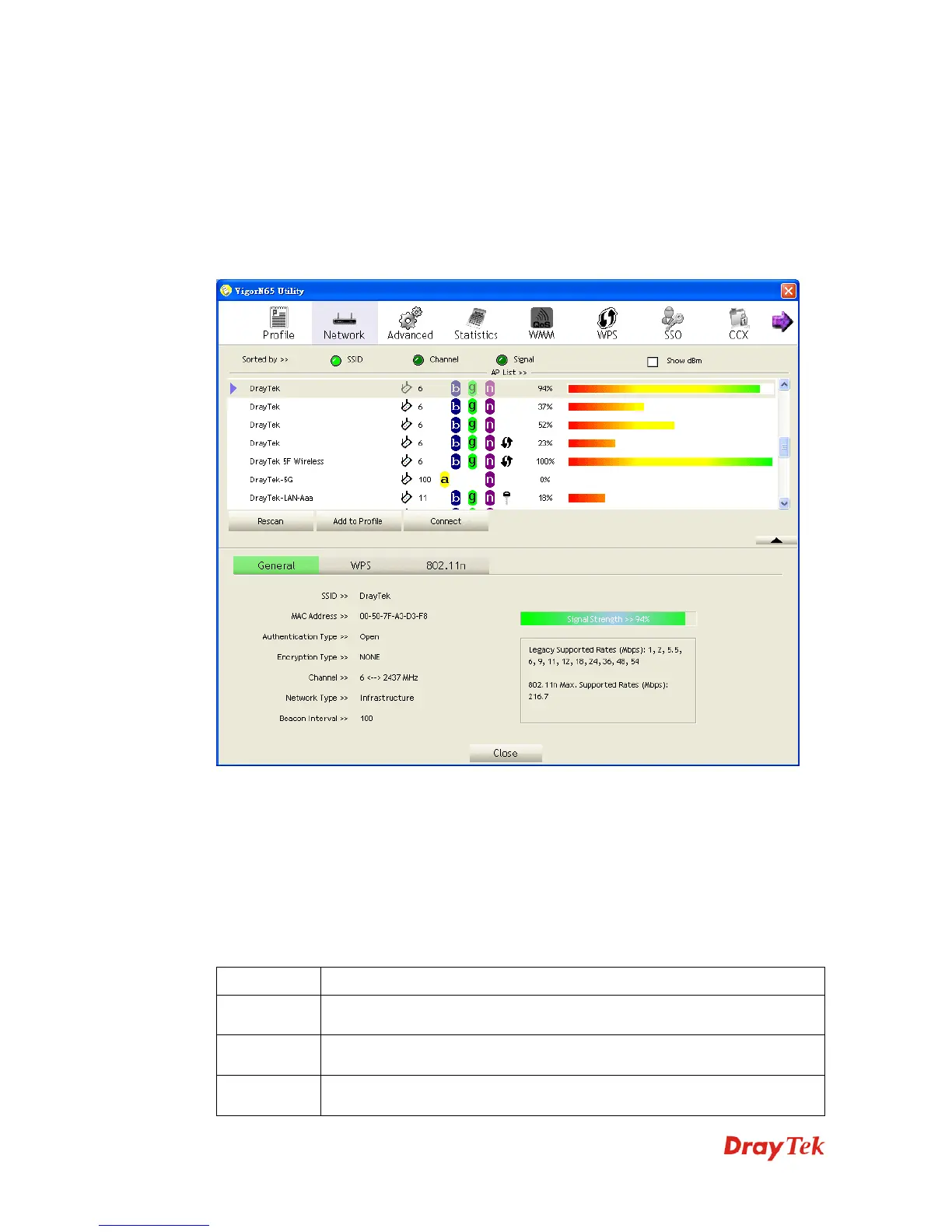 Sorted by >> You can decide how to sort all listed access point by SSID, Channel, or