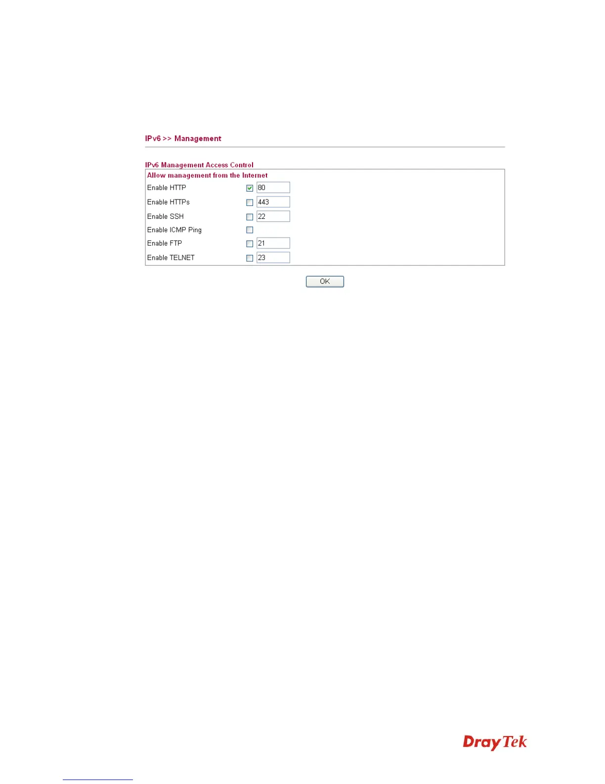 This page allows you to manage the settings for IPv6 access control including settings of