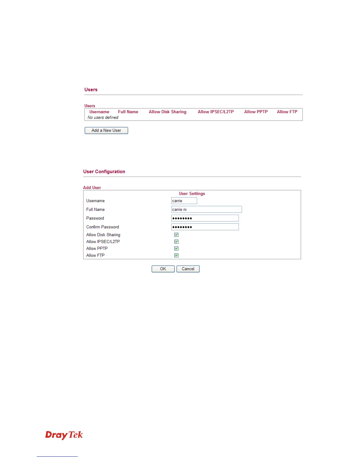 This page allows you to set user’s setting that allowed to use PPTP, FTP, IPSEC/L2TP