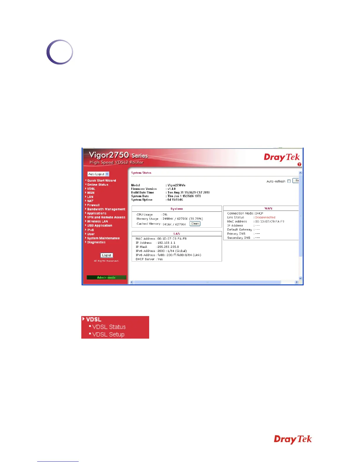 This menu allows you to check VDSL status and configure VDSL settings for you request.