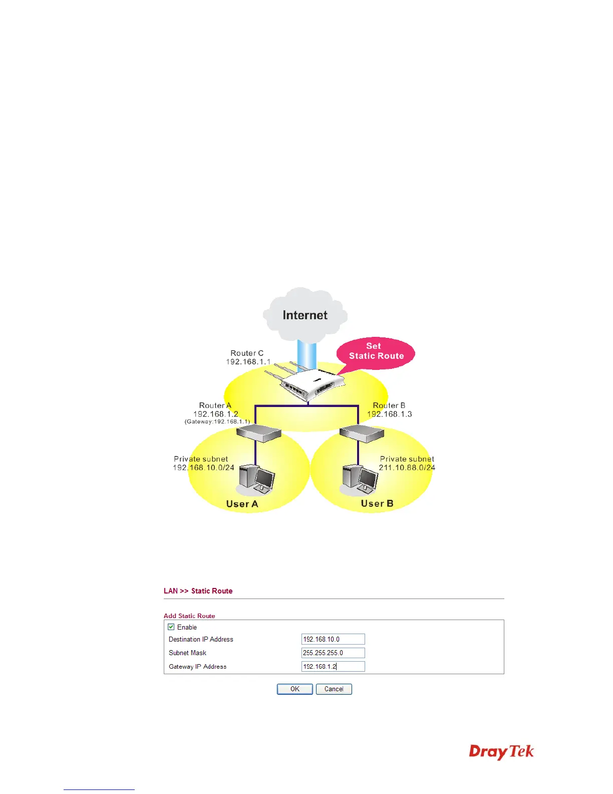 Before setting Static Route, user A cannot talk to user B for Router A can only forward