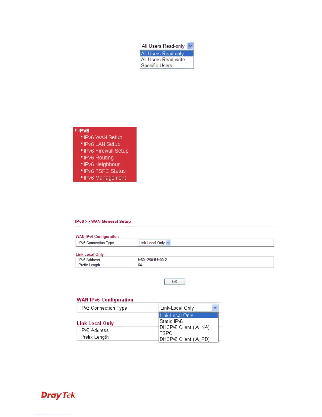 Link-Local only, Static IPv6, DHCPv6 and TSPC. Each type requires different parameter