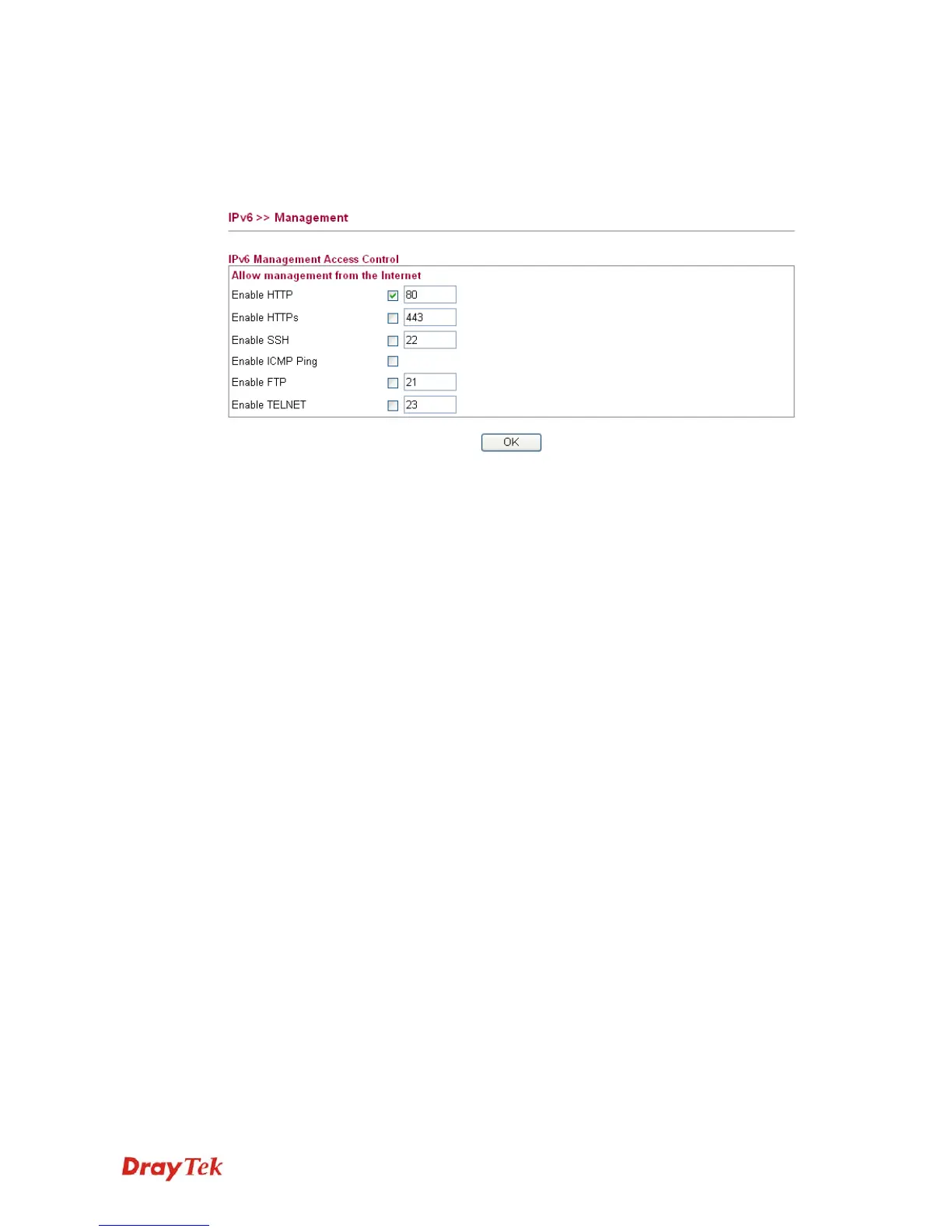This page allows you to manage the settings for IPv6 access control including settings of