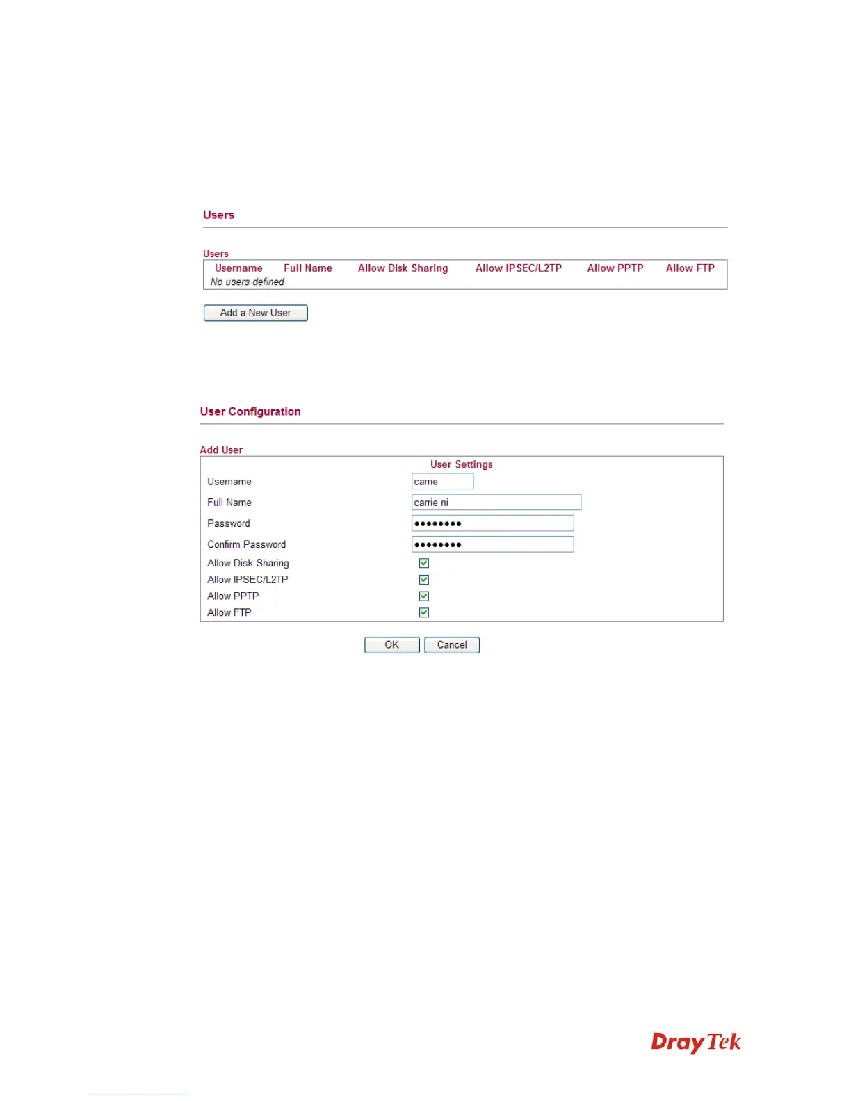 This page allows you to set user’s setting that allowed to use PPTP, FTP, IPSEC/L2TP