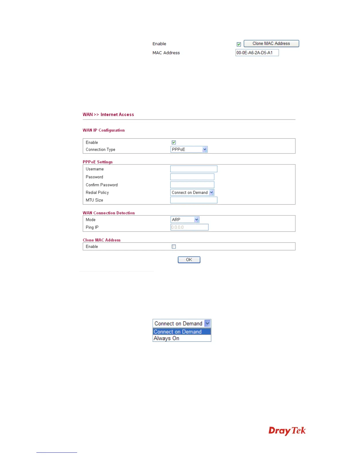 Redial Policy If you want to connect to Internet all the time, you can choose