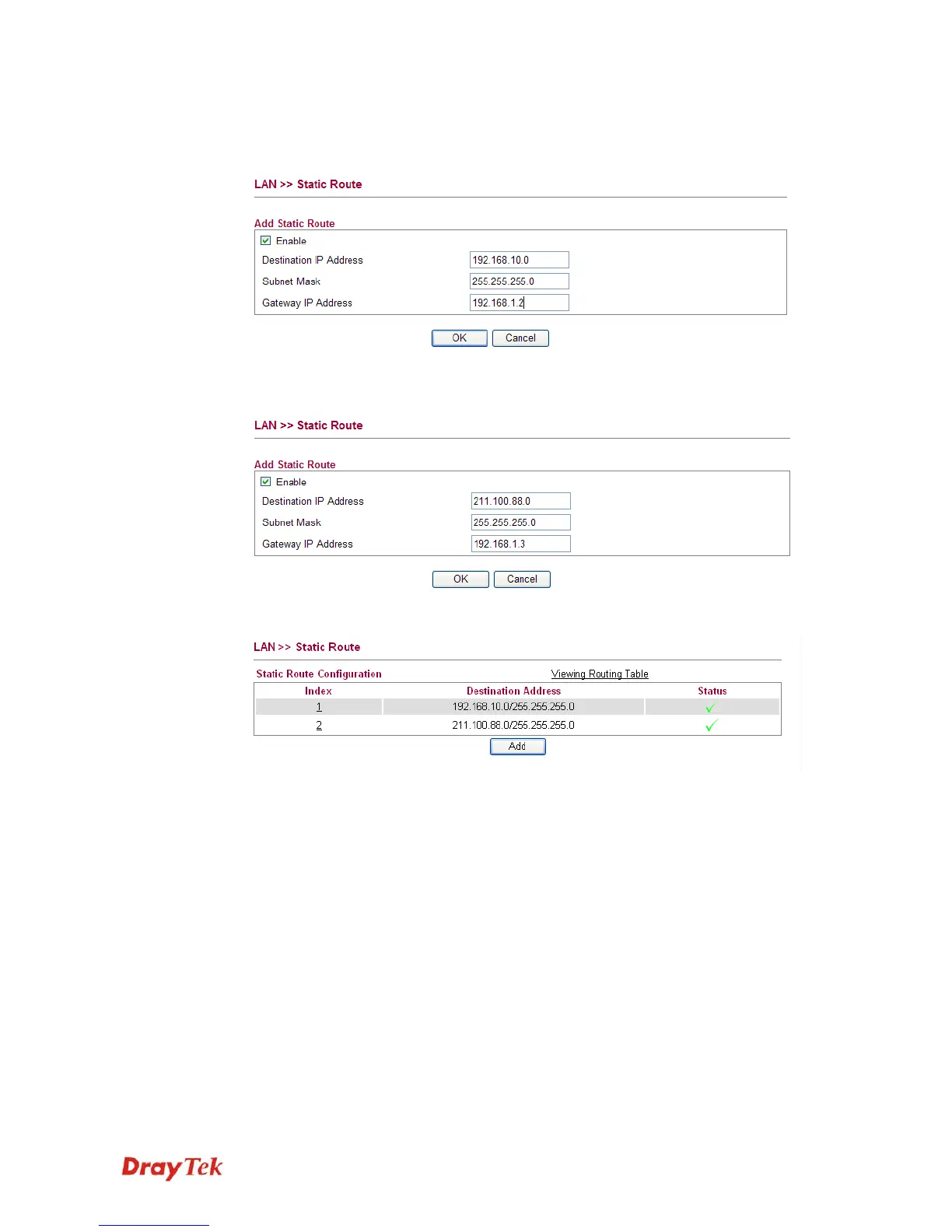 1. Click the LAN - Static Route and click Add. Check the Enable box. Please add a static
