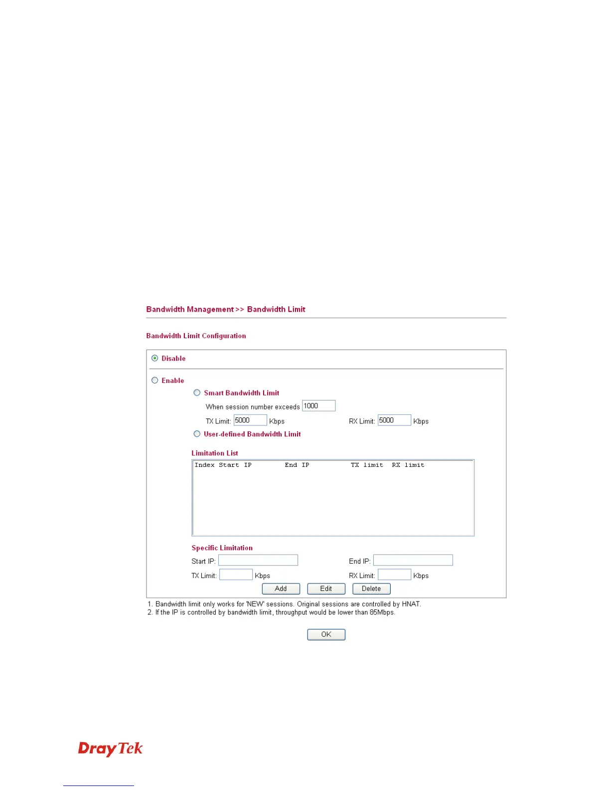 To activate the function of limit bandwidth, simply click Enable and set the default or