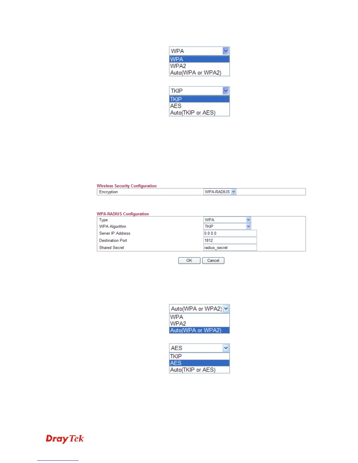 WPA Algorithm Select TKIP, AES or auto as the algorithm for WPA.