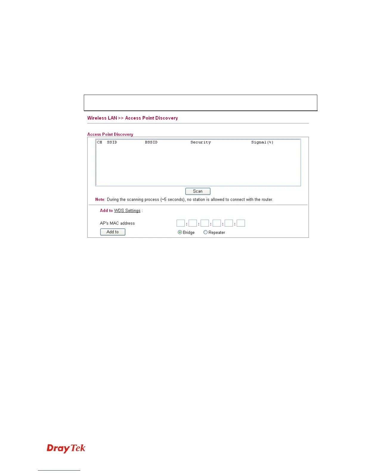 This page is used to scan the existence of the APs on the wireless LAN. Please click Scan to