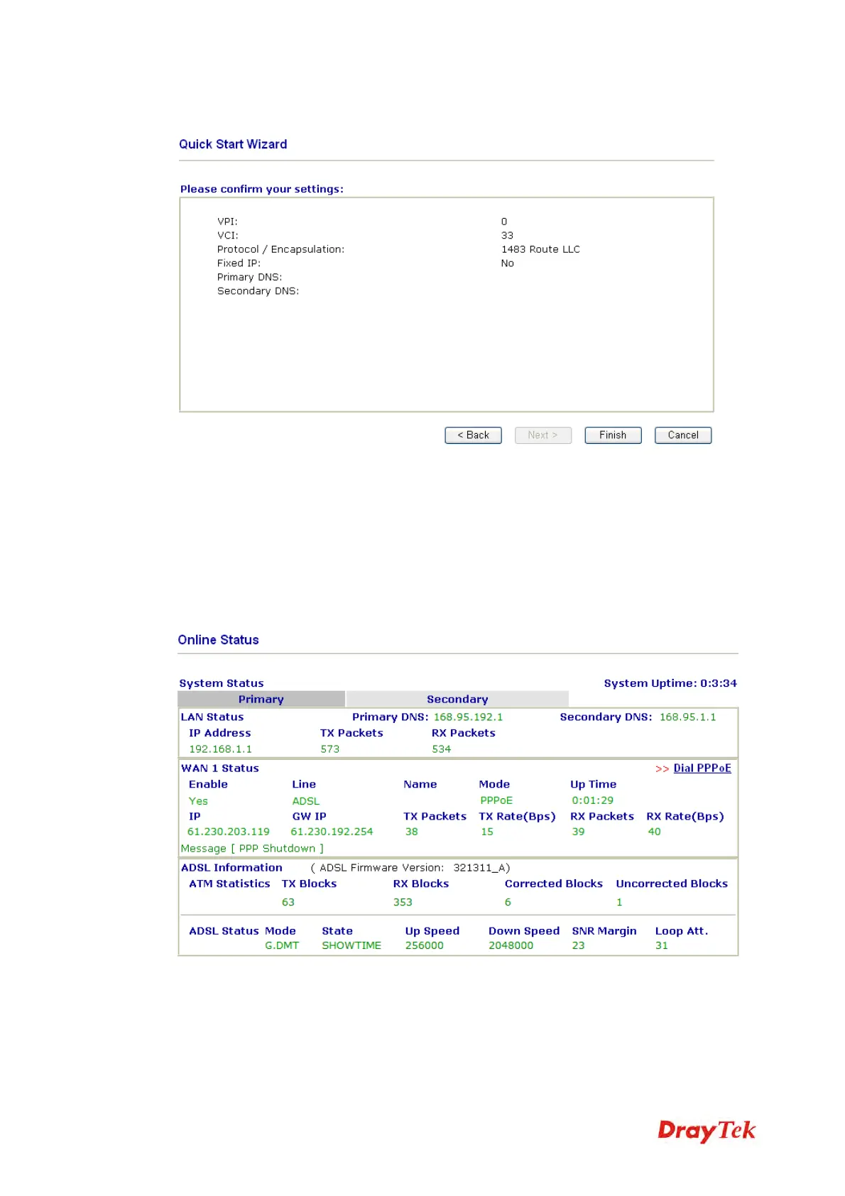 The online status shows the system status, WAN status, ADSL Information and other status