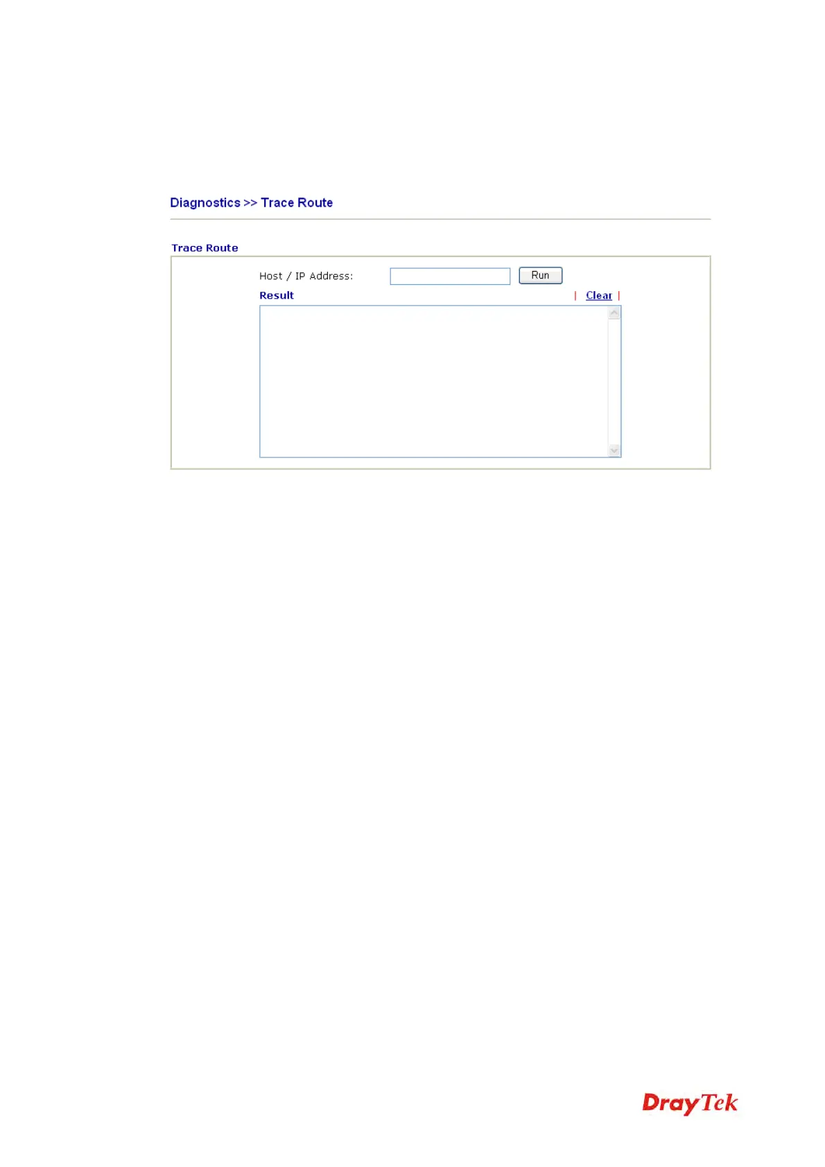 Click Diagnostics and click Trace Route to open the web page. This page allows you to