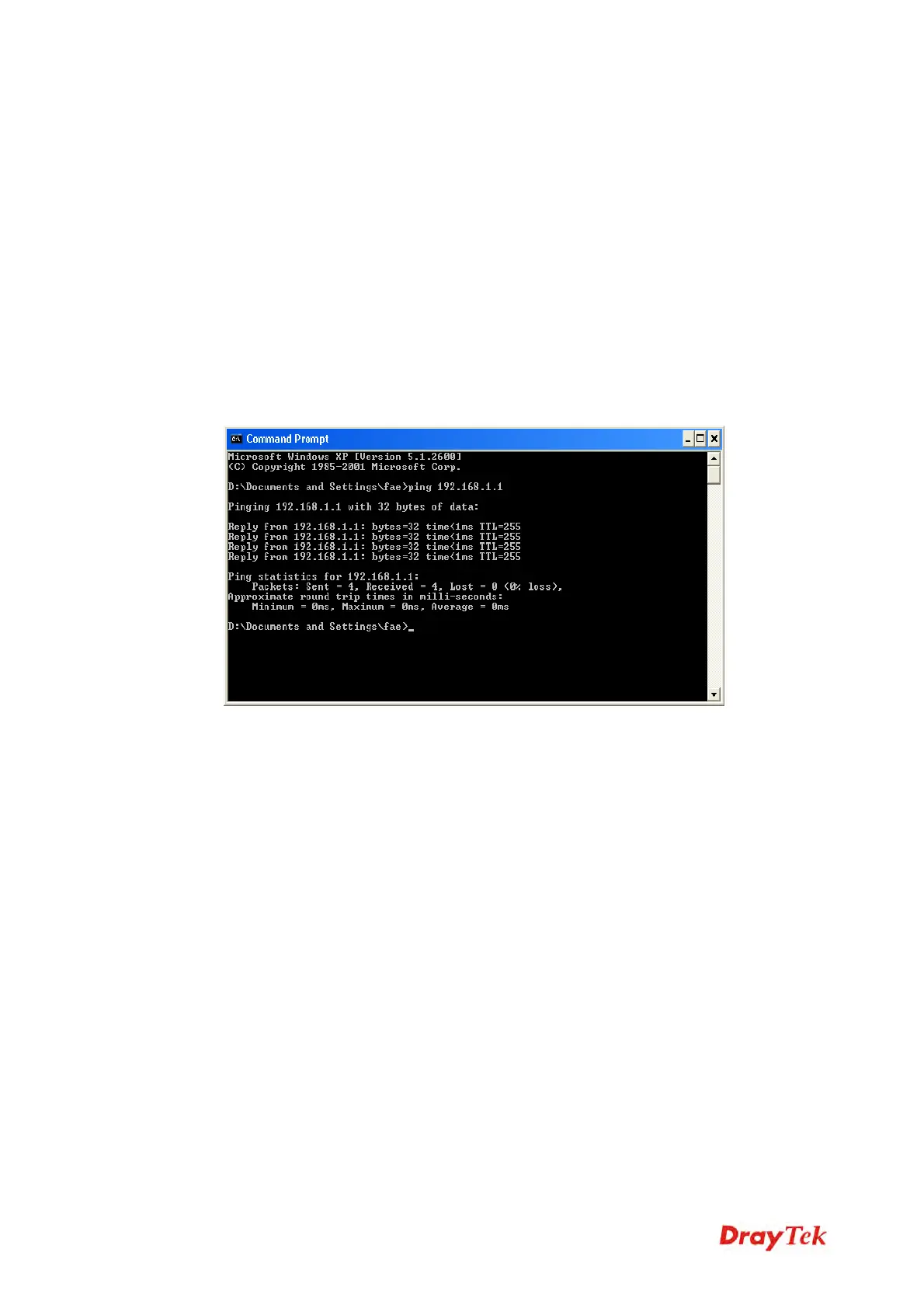 3. Type ping 192.168.1.1 and press [Enter]. If the link is OK, the line of “Reply from