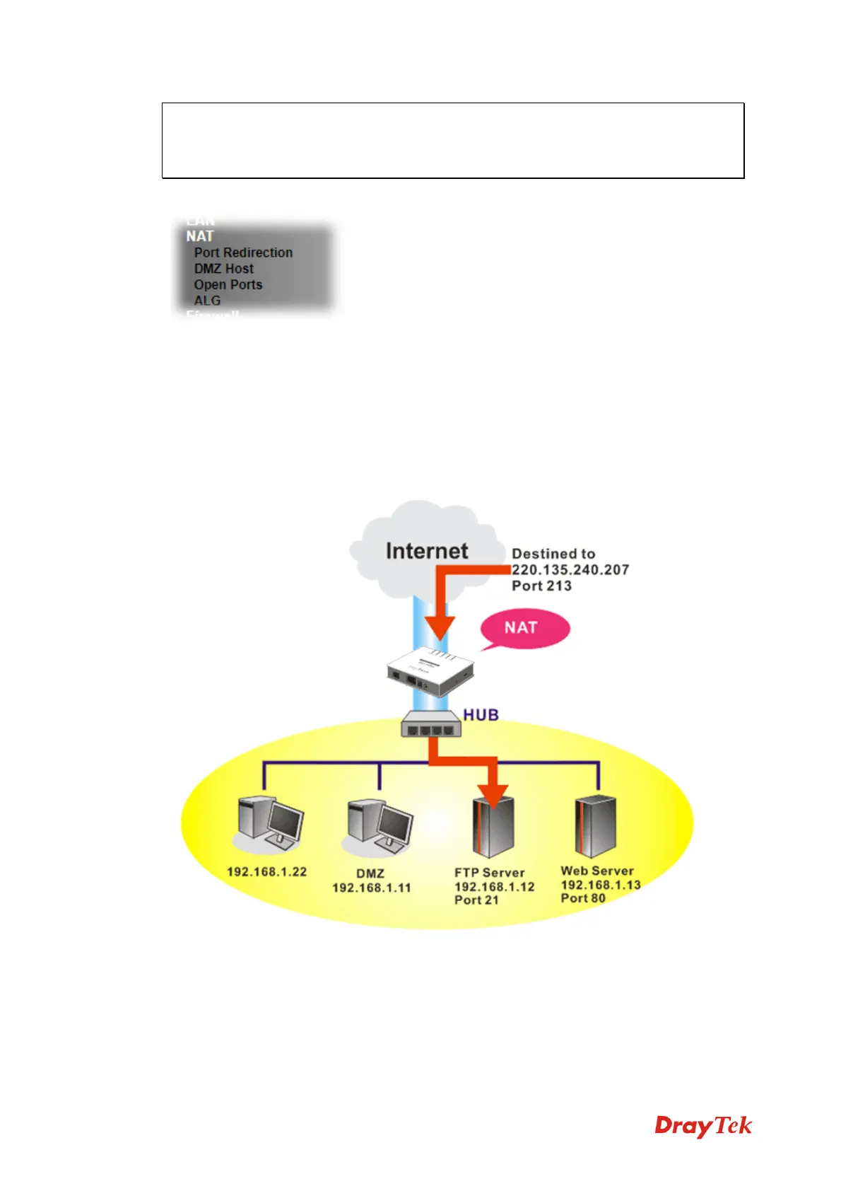 To use this function, please go to NAT page and choose Port Redirection web page. The