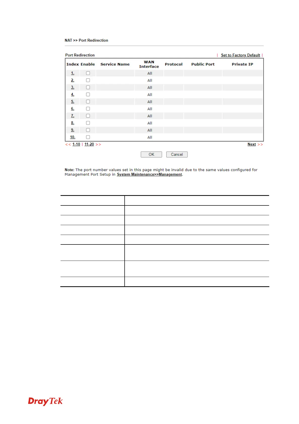 Press any number under Index to access into next page for configuring port redirection.