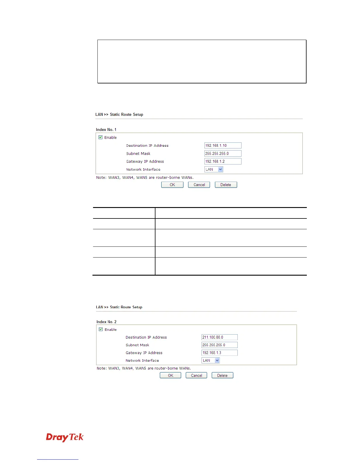 2. Click the LAN - Static Route and click on the Index Number 1. Check the Enable