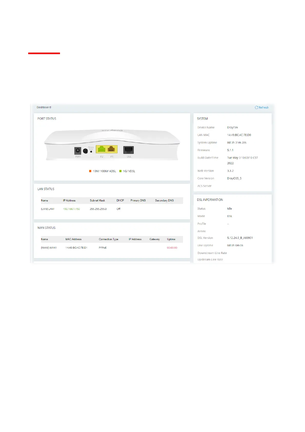Dashboard shows port status, LAN status, system status, LAN/WAN Usage and DSL information.