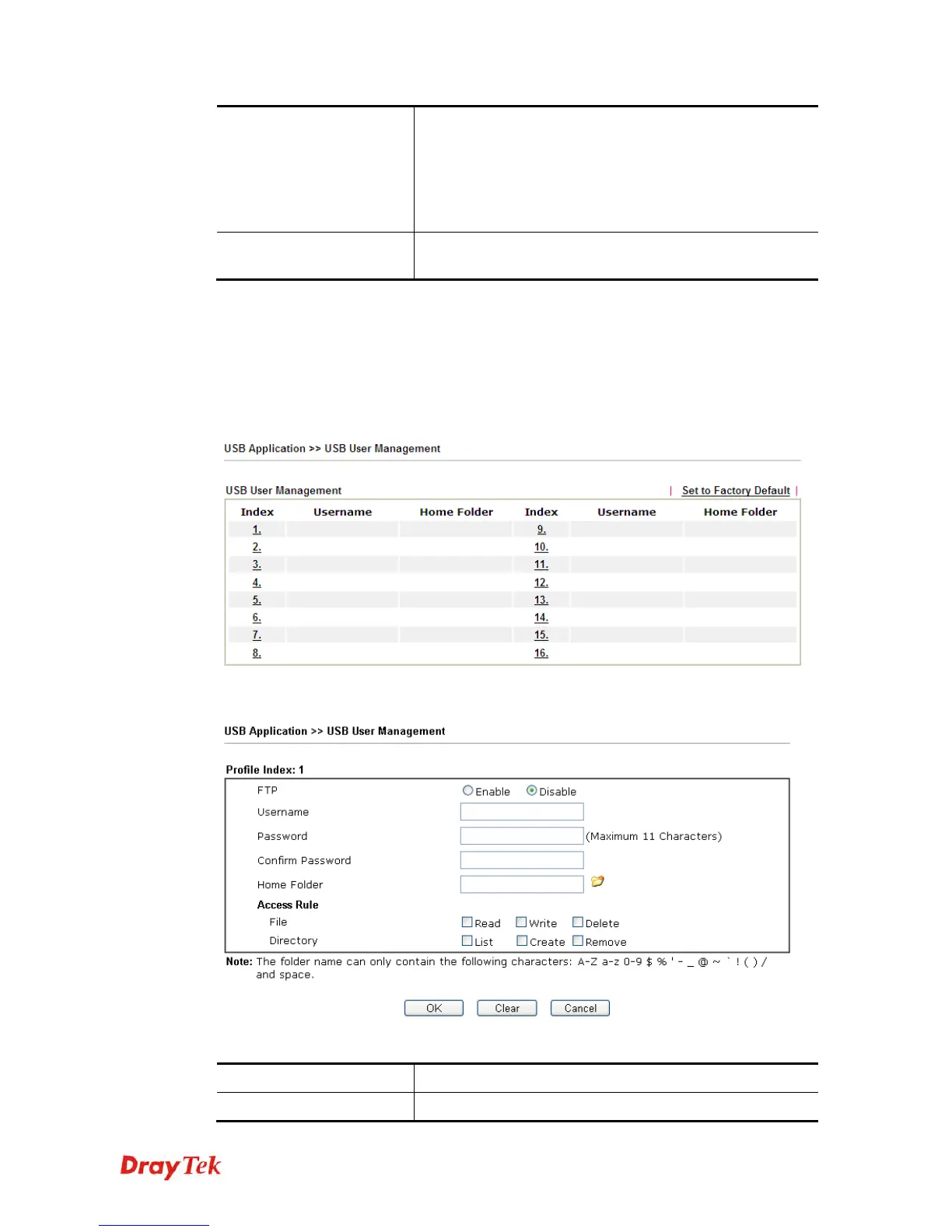 This page allows you to set profiles for FTP users. Any user who wants to access into the USB