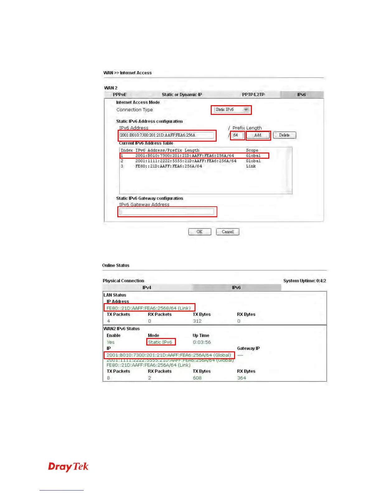 Choose Static IPv6. Type IPv6 address, Prefix Length and Gateway Address.