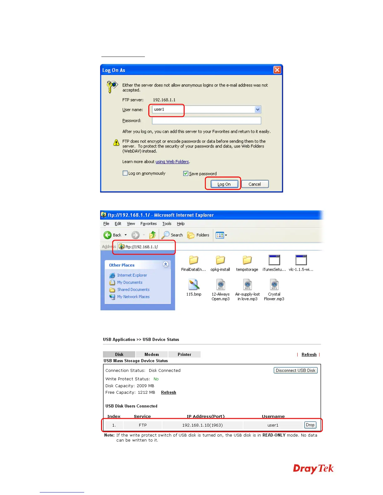 6. Return to USB Application >> USB Disk Status. The information for FTP server will