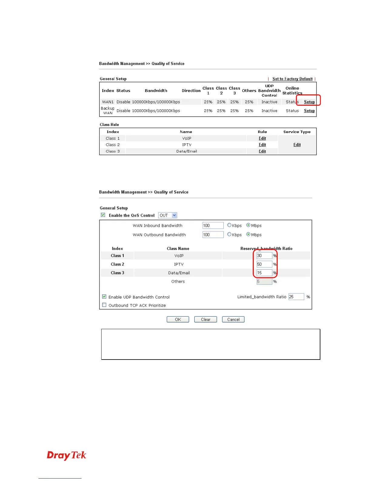 10. In the Setup page, check the box of Enable the QoS Control. Type 30, 50 and 15 in the