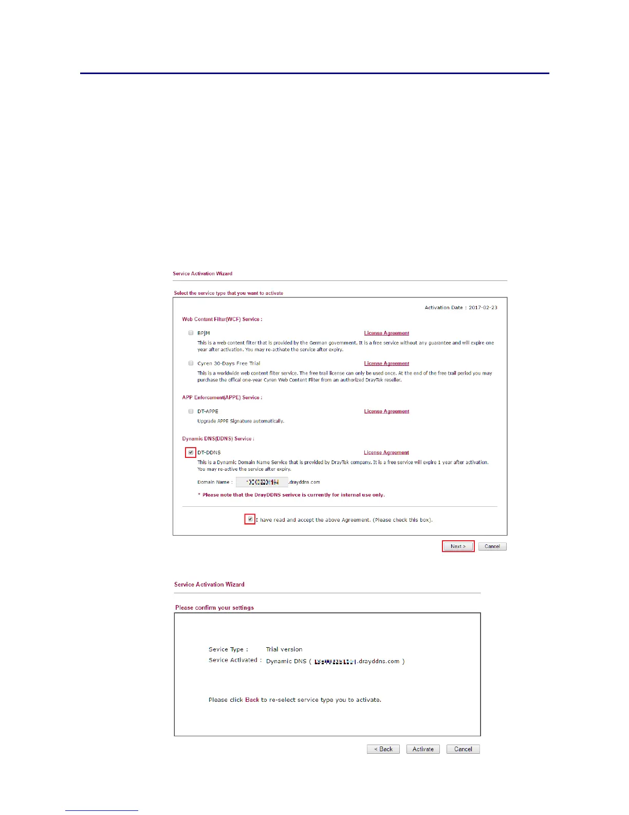 server, then tick DT-DDNS and I have read and accept the above Agreement, click