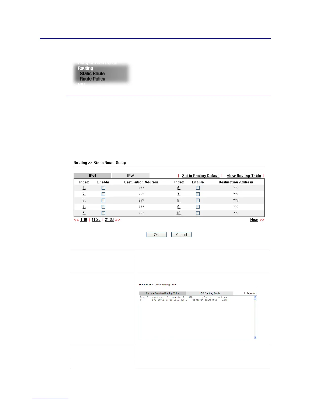 Go to Routing >> Static Route. The router offers IPv4 and IPv6 for you to configure the static