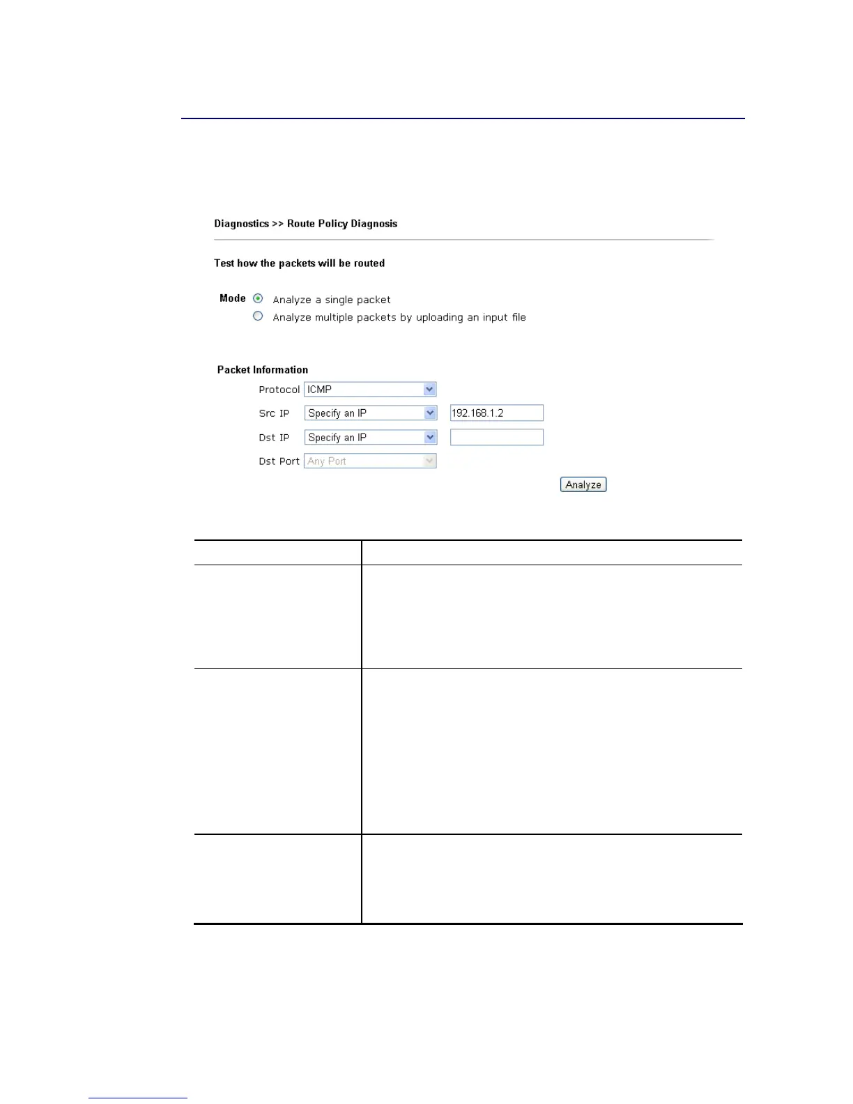 Mode Analyze a single packet – Choose such mode to make Vigor