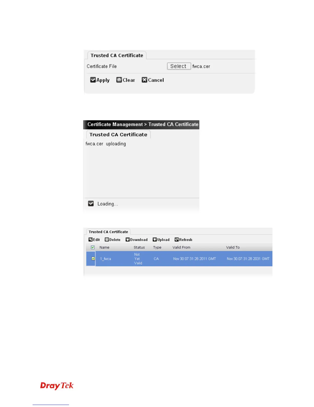 4. A trusted CA certificate has been uploaded to Vigor router and displayed on this page.