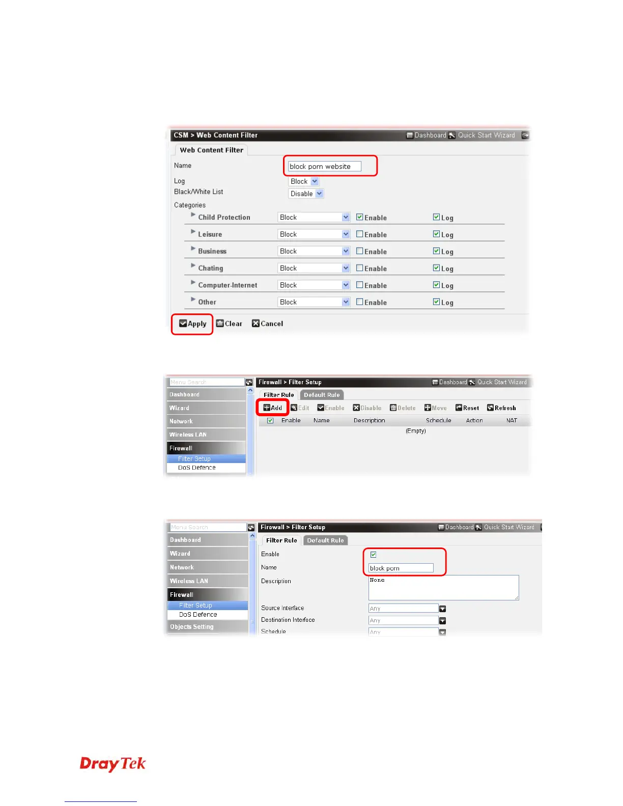 10. Next, open Firewall>>Filter Setup to set a rule to activate the new created WCF rule