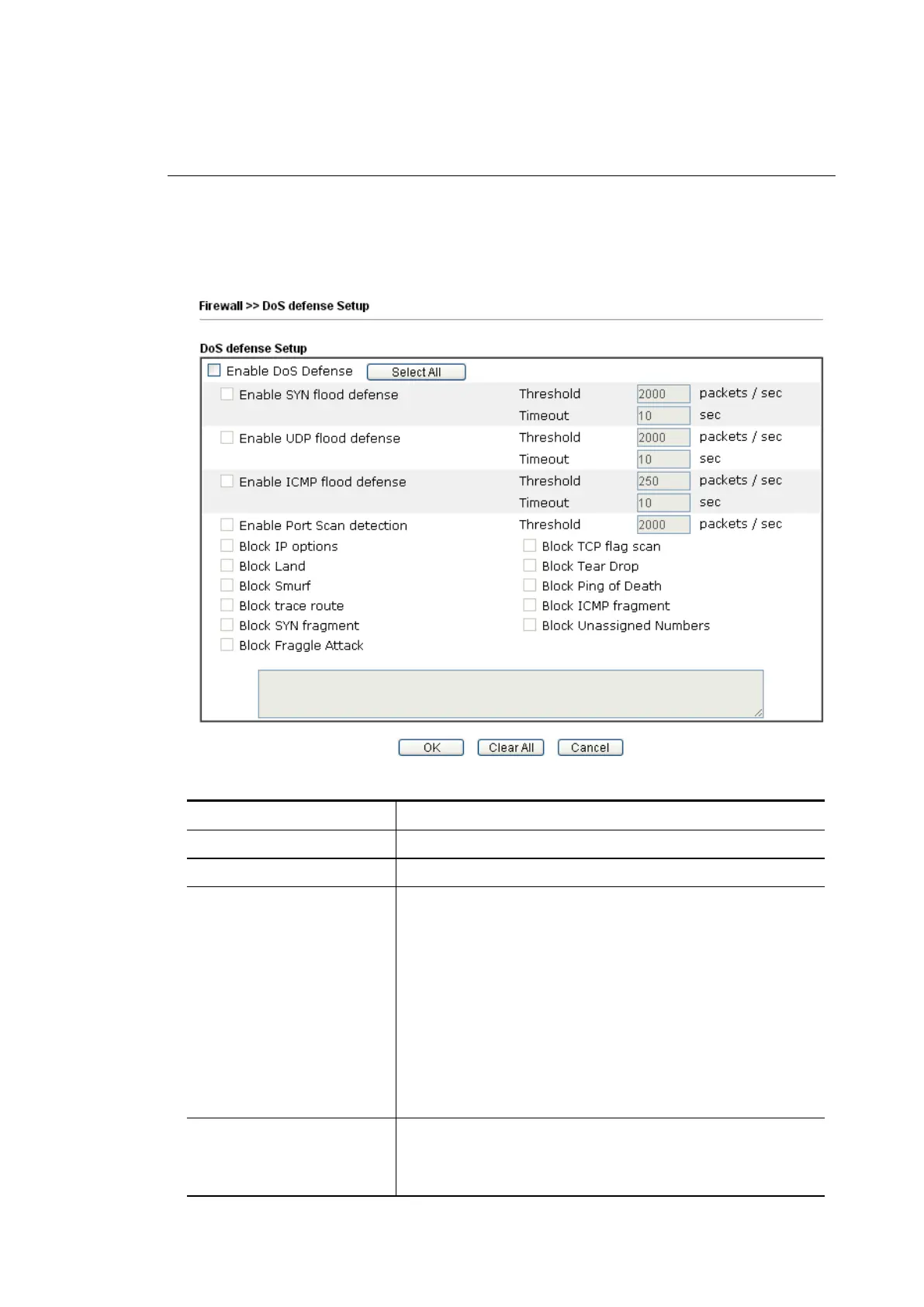 the DoS Defense setup. The DoS Defense functionality is disabled for default.