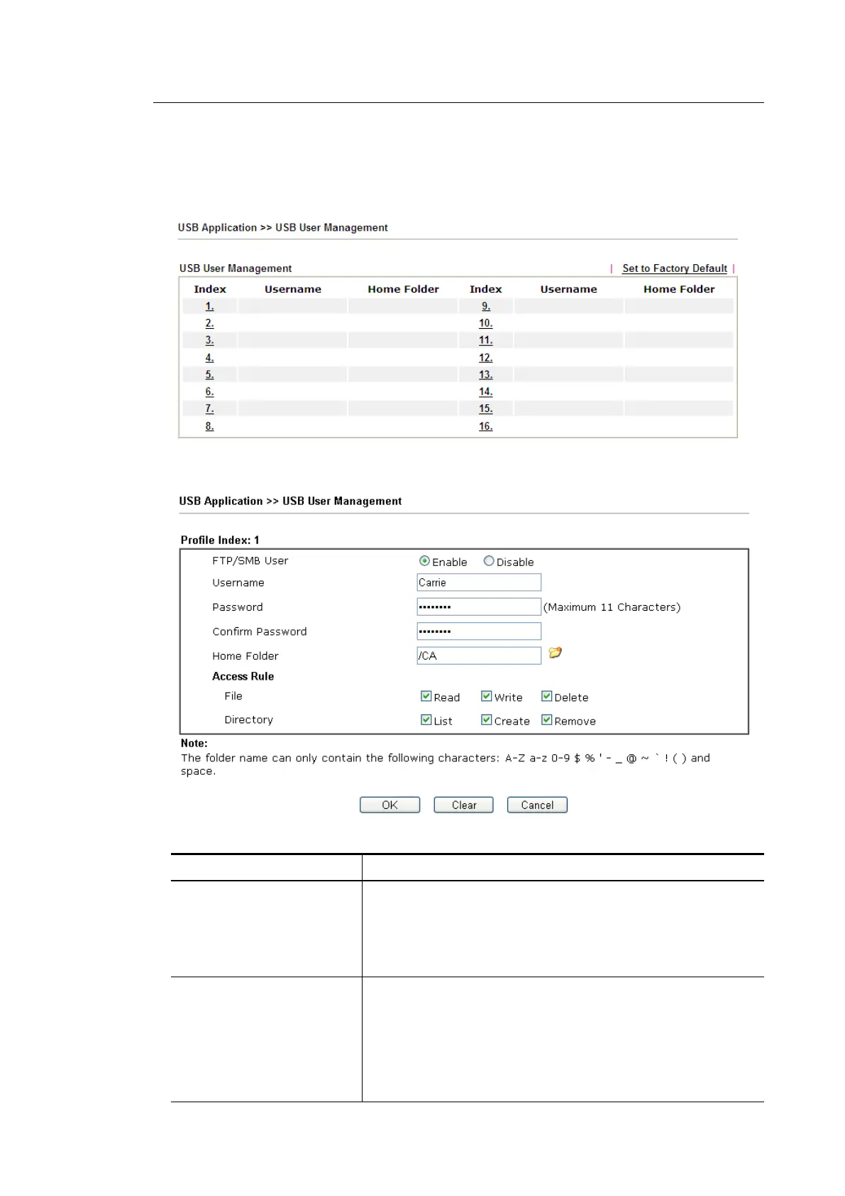 the USB storage disk must type the same username and password configured in this page.