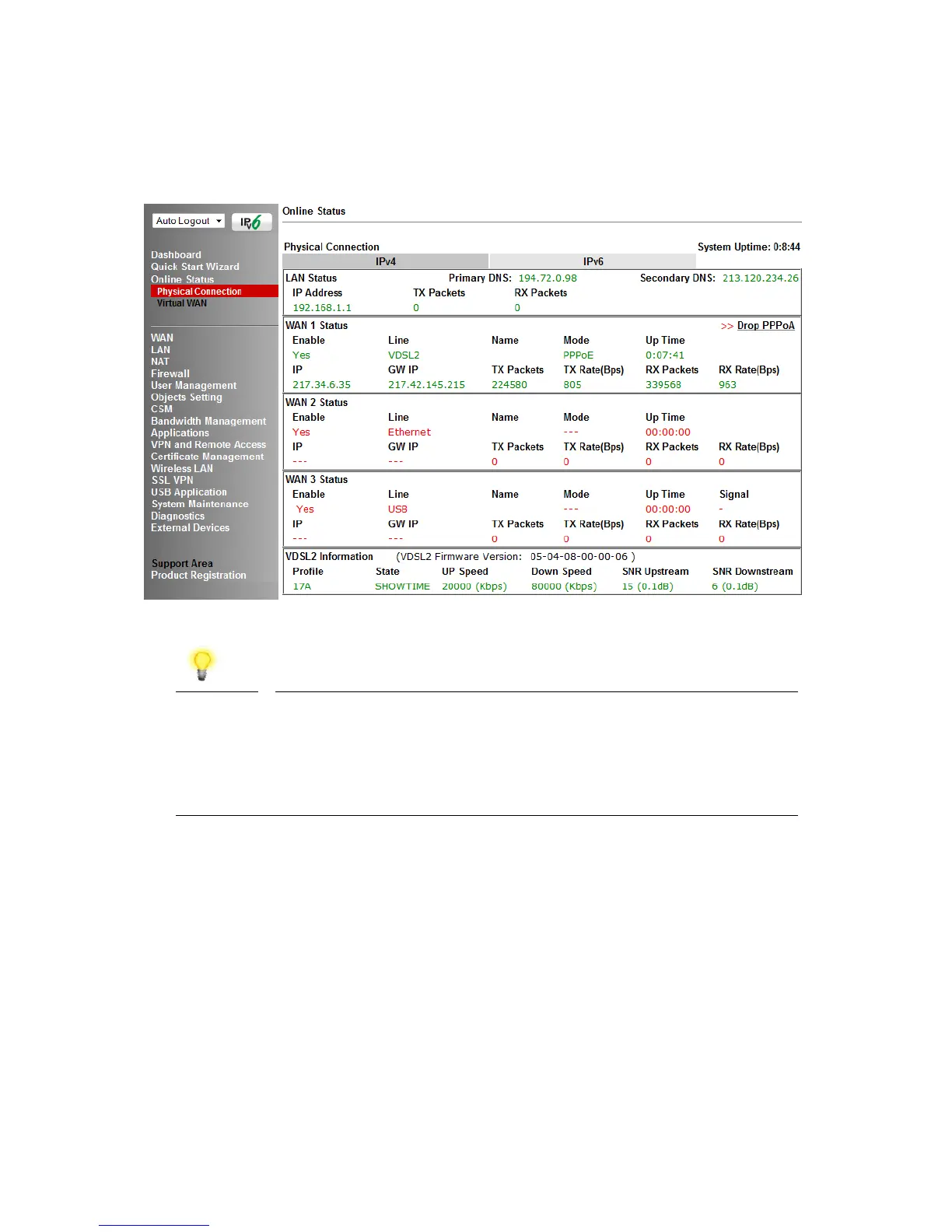 will display the VDSL information and PPP connection status, if the WAN1 section