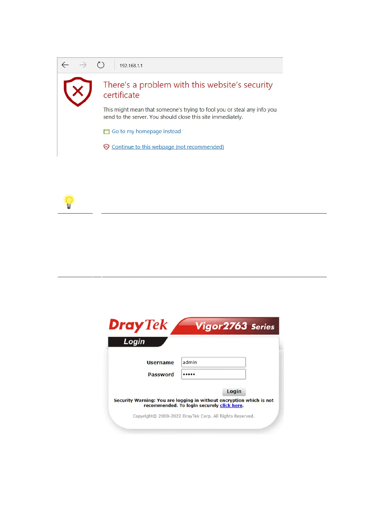 Note This warning appears because the router's default certificate is