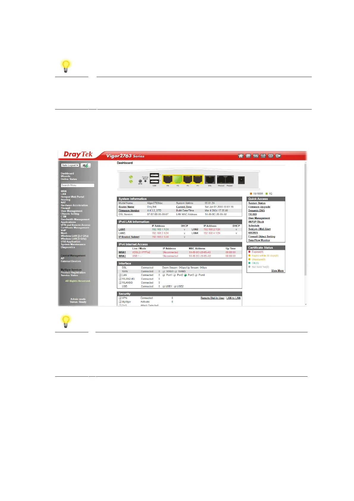 Upon successful login, the router will display the Dashboard, which shows a