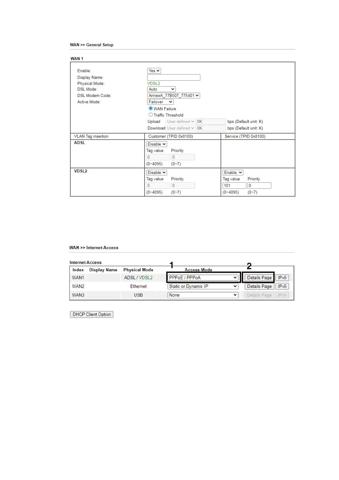 Set the WAN1 Access Mode to PPPoE / PPPoA, then click the Details Page