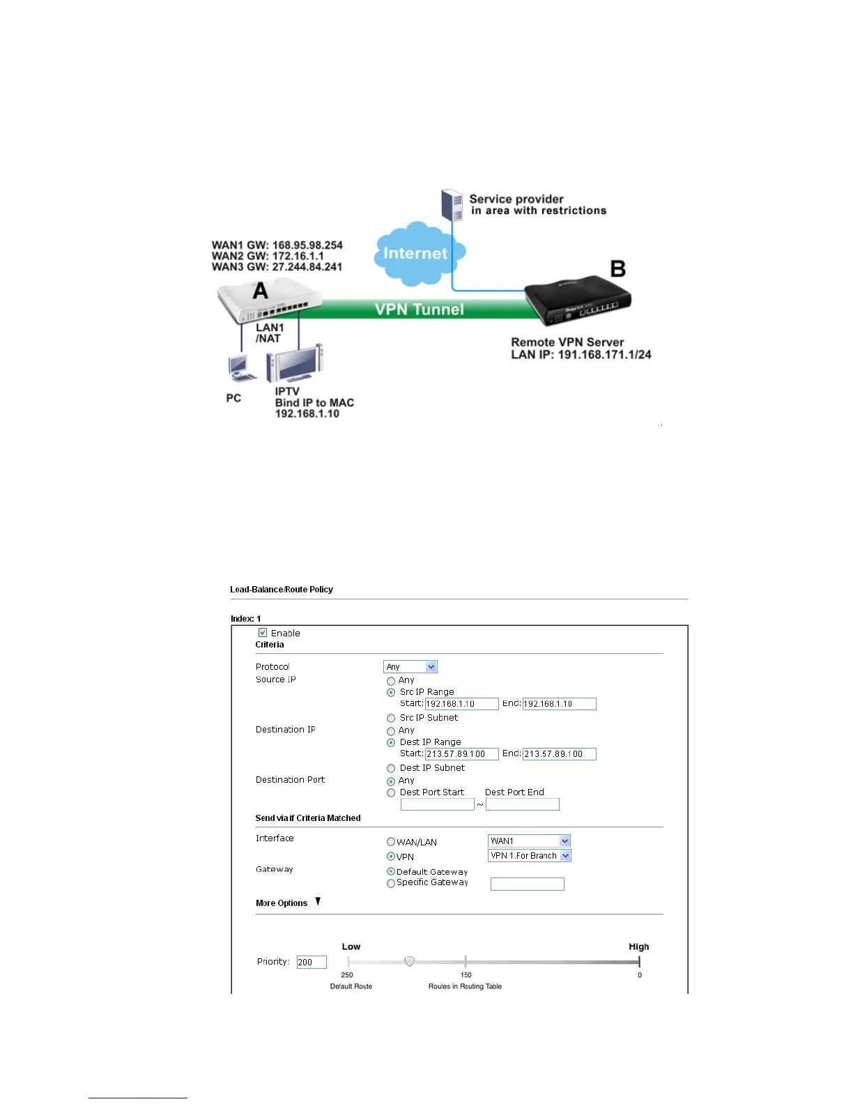 “213.57.89.100” as the Destination IP for the remote VPN server; and choose VPN as the