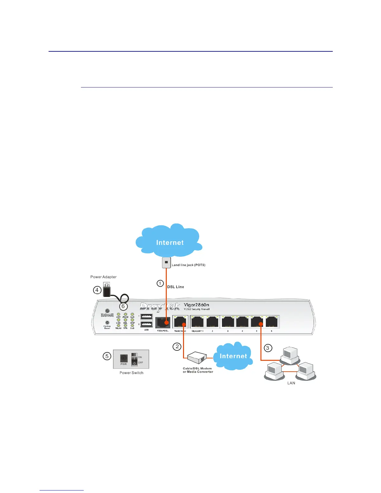 1. Connect the DSL interface to the land line jack with a DSL line cable.