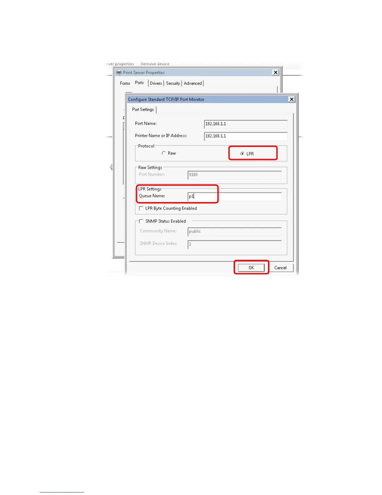14. Select "LPR" on Protocol, type p1 (number 1) as Queue Name. Then click OK. Next