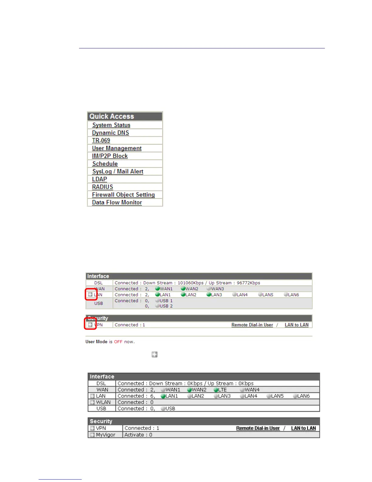 In addition, quick access for VPN security settings such as Remote Dial-in User and LAN to