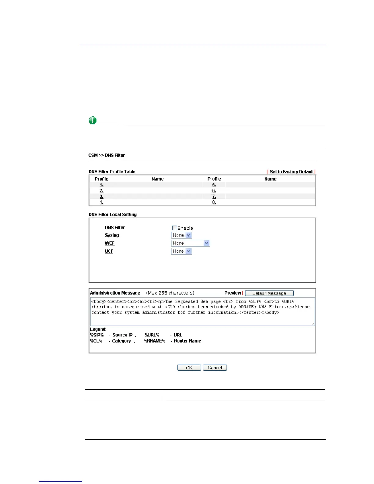 DNS Filter Profile Table It displays a list of different DNS filter profiles (with