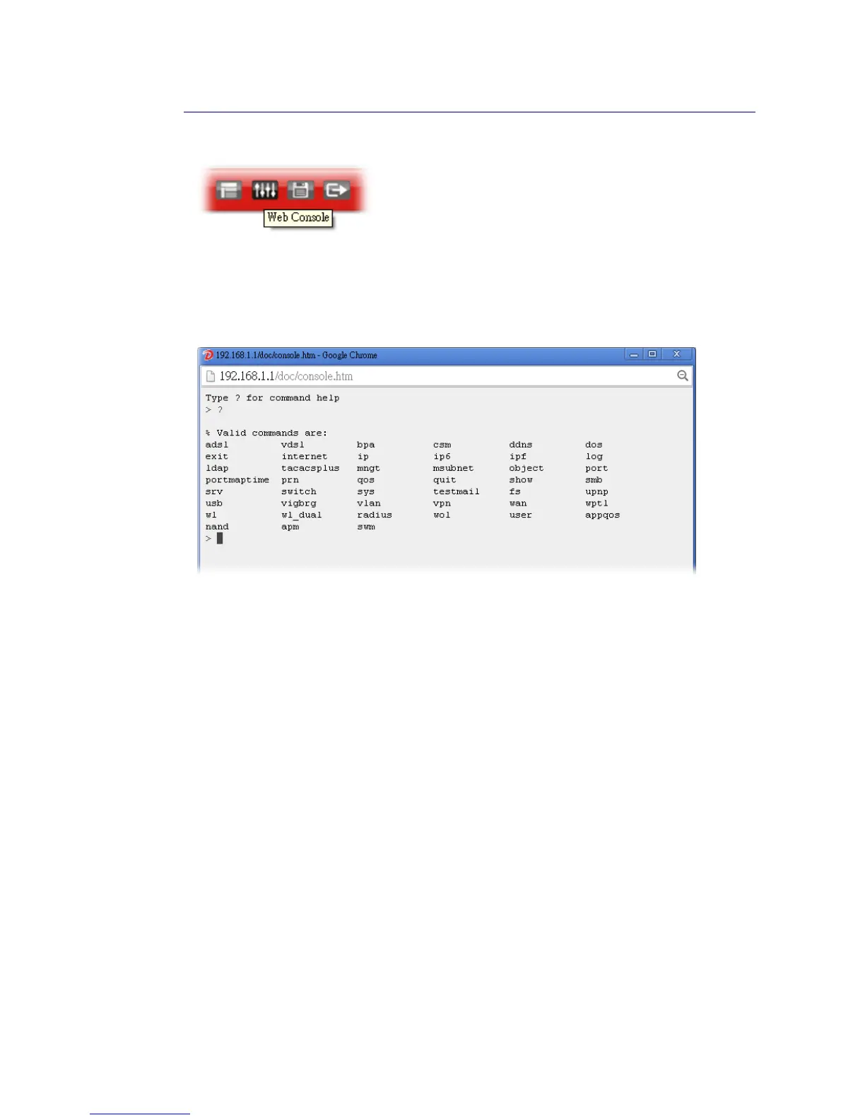 Click the Web Console icon on the top of the main screen to open the following screen.