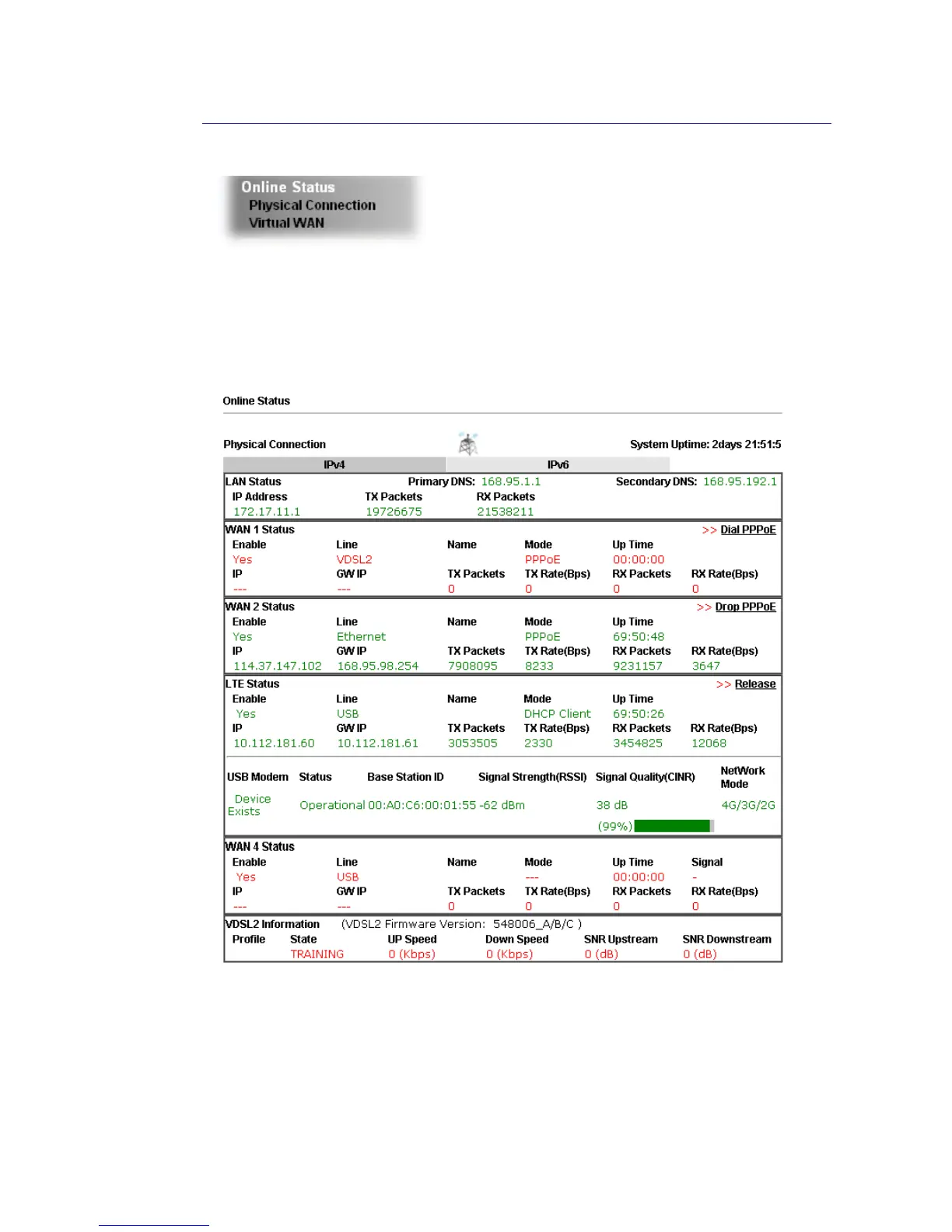 Such page displays the physical connection status such as LAN connection status, WAN