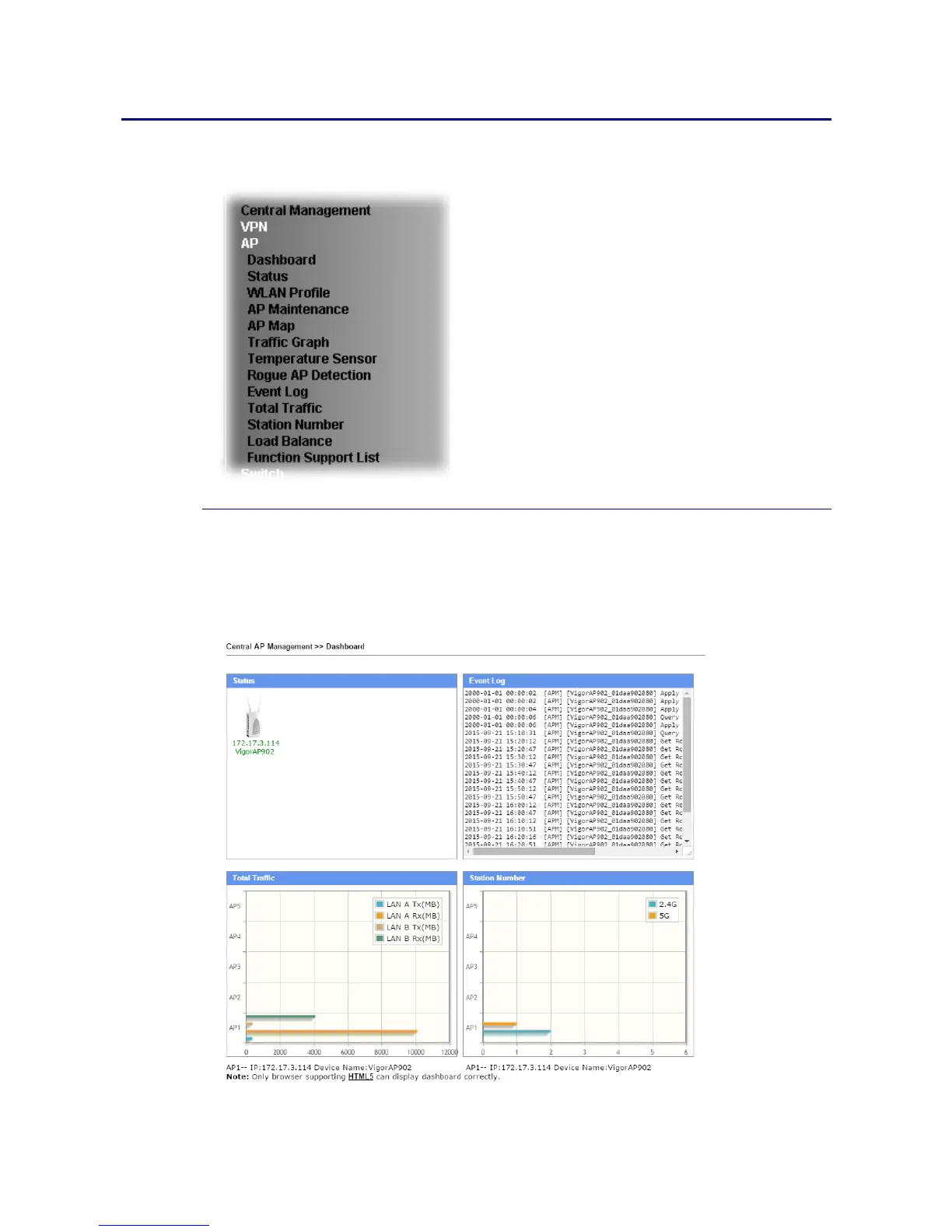This page shows VigorAP’s information about Status, Event Log, Total Traffic or Station