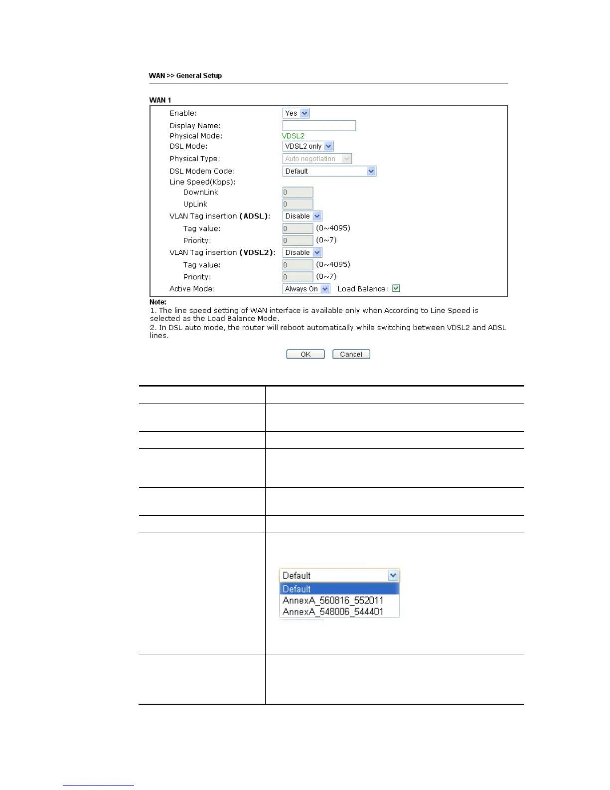 DSL Mode Specify the physical mode (VDSL or ADSL) for such router