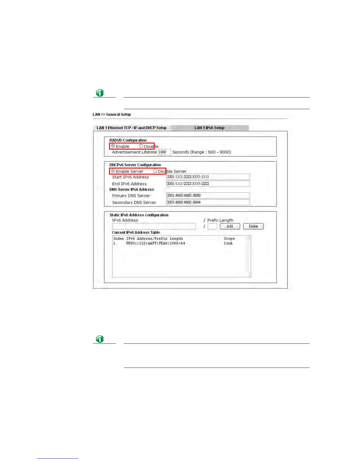 2. In the field of RADVD Configuration, the default setting is Enable. The client’s PC will