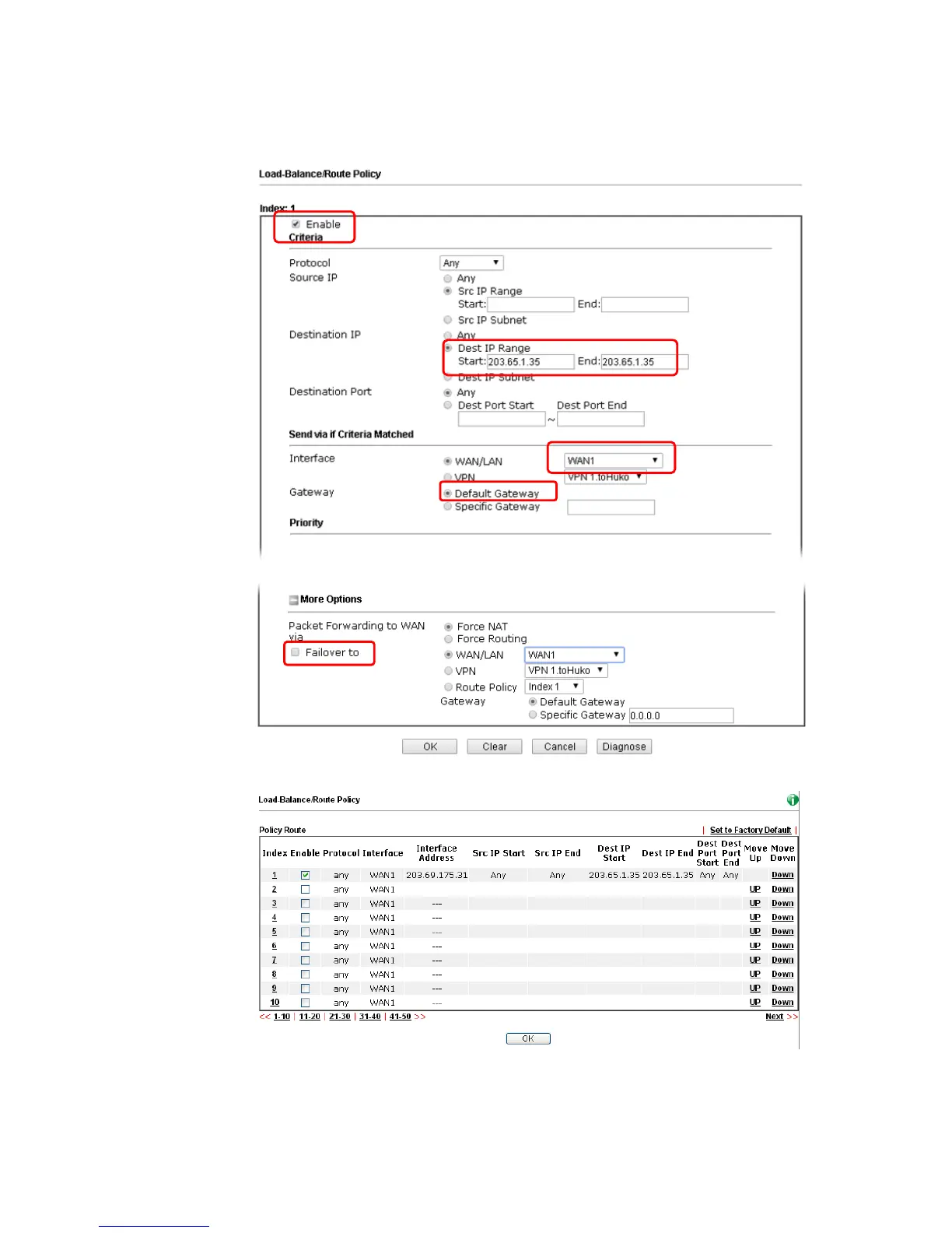 and 203.65.1.35; choose WAN1 as the Interface; click default gateway; do not check