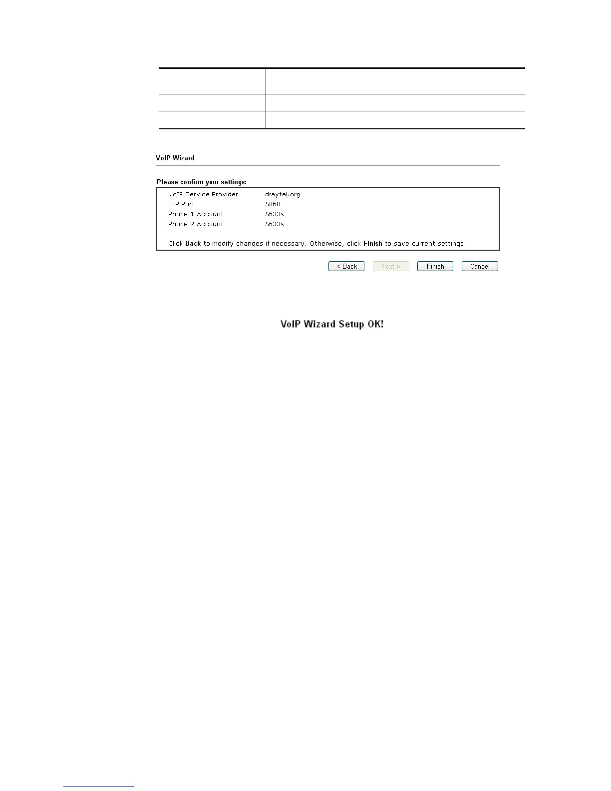 4. Click Finish. A page of VoIP Wizard Setup OK!!! will appear.