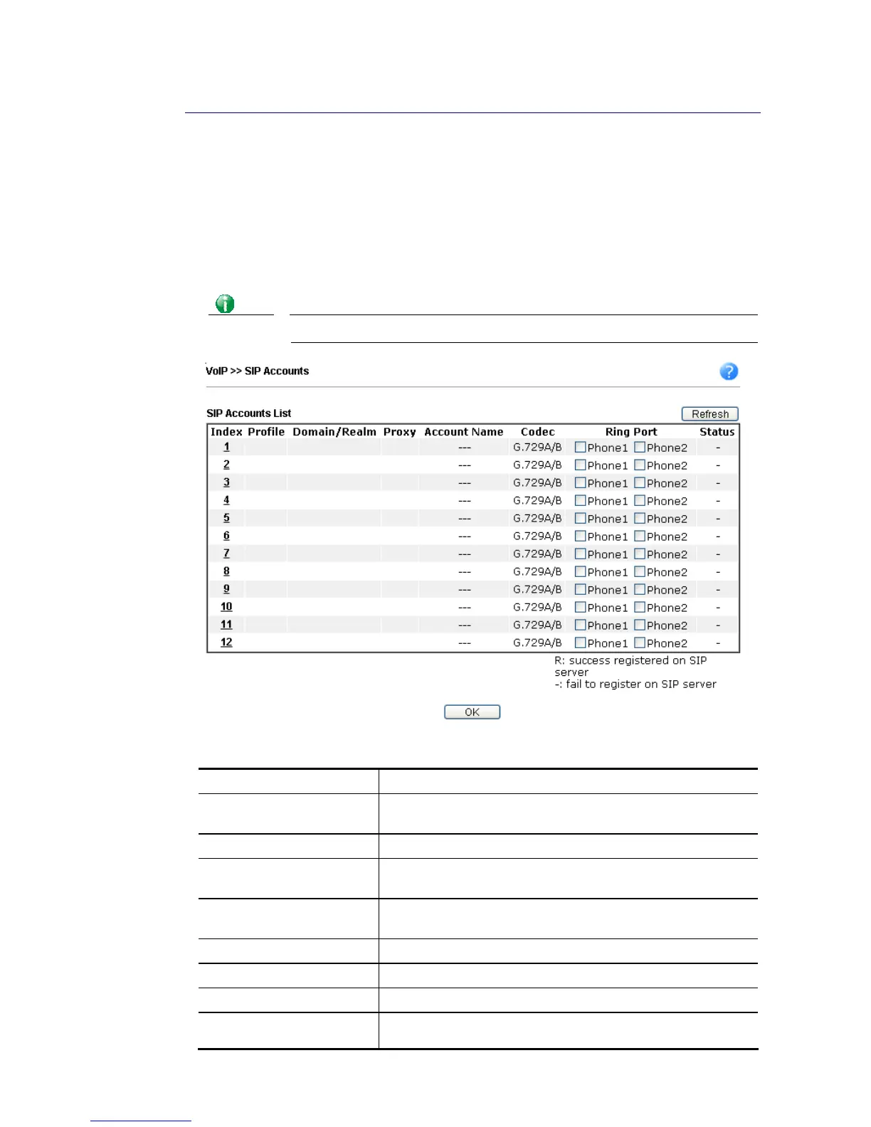 Status Show the status for the corresponding SIP account. R means