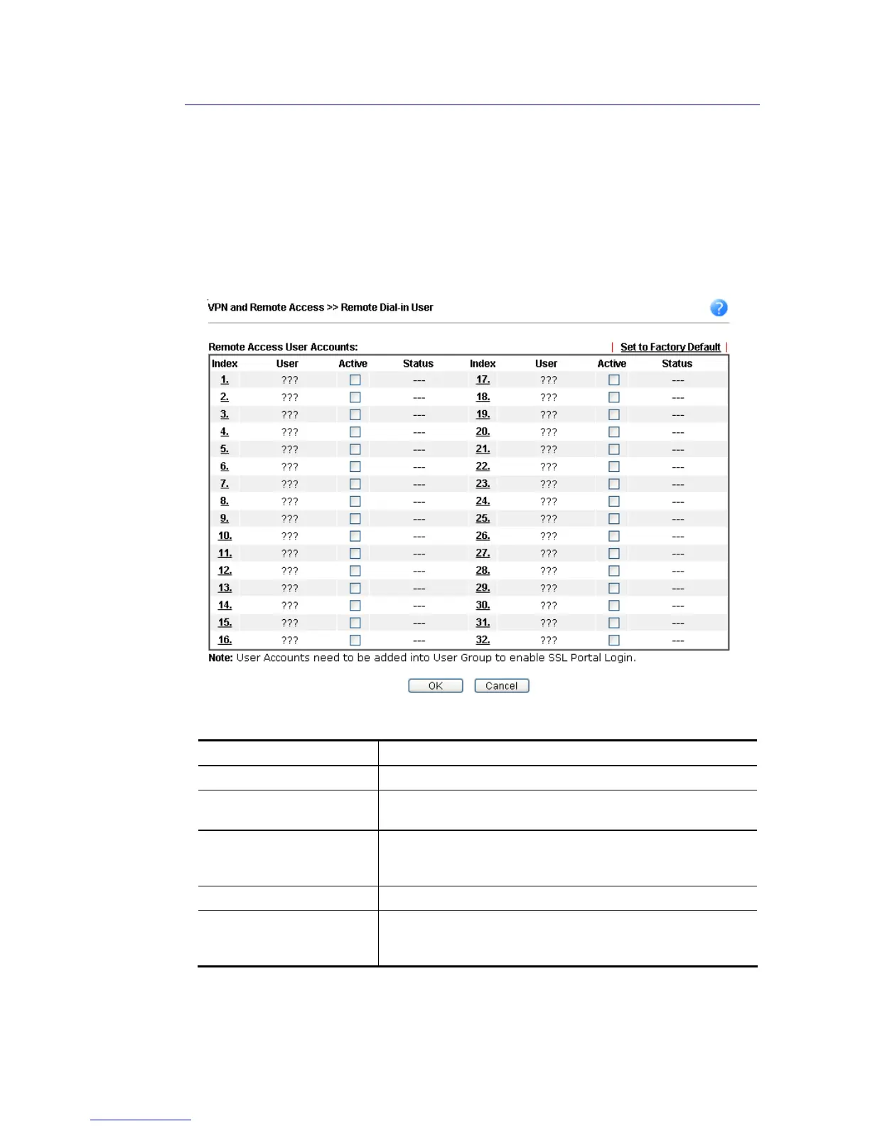 Click each index to edit one remote user profile. Each Dial-In Type requires you to fill the